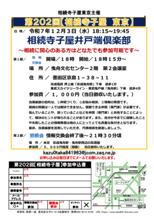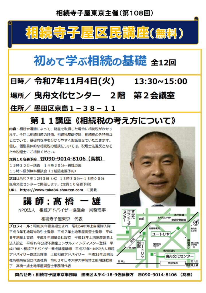第108回 相続寺子屋東京主催「寺子屋区民講座」のお知らせ コラム 2025.10.072025.11.02 「親子で学ぶ相続の基礎」(全12回) 第11回講座 「相続税の考え方について」 日時:令和7年11月4日(火) 13:30~15:00(15:00~個別無料相談会:1組限定 要予約) 場所:曳舟文化センター 2階 第2会議室 定員:10名(要予約) 住所:東京都墨田区京島1-38-11 講師:髙橋 一雄(NPO法人 相続アドバイザー協議会 常務理事) お問い合わせ:相続寺子屋東京事務局(☎090-9014-8106:髙橋) 詳しくはこちら