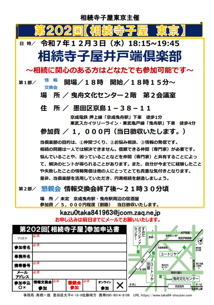 「相続寺子屋井戸端倶楽部~相続に関心のある方はどなたでも参加可能です~」