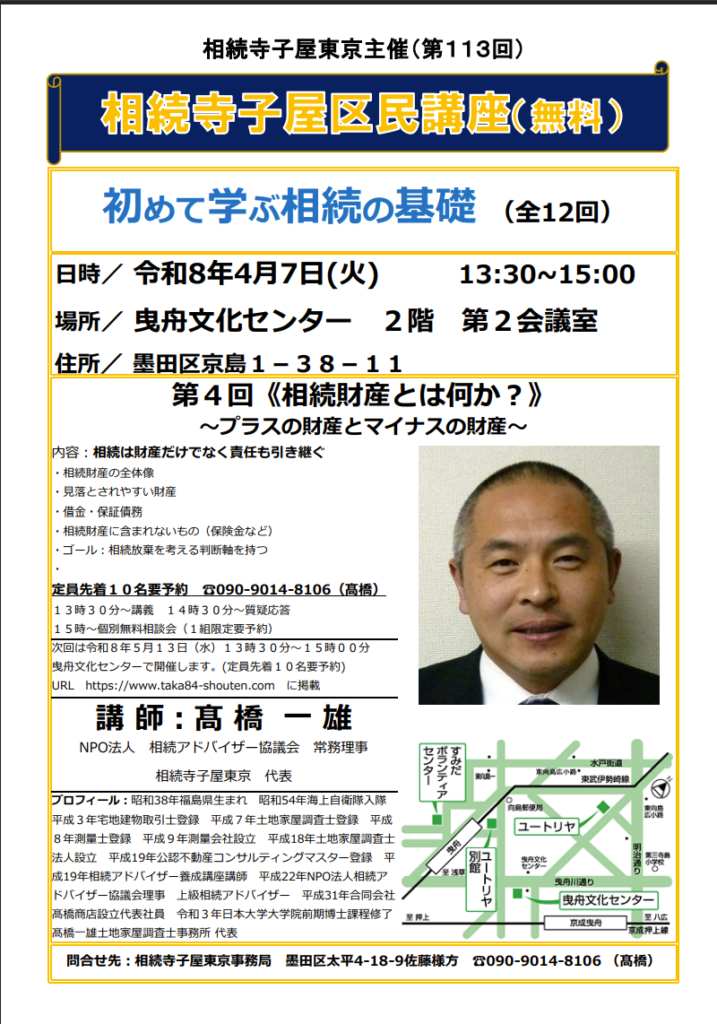 第113回 相続寺子屋東京主催「寺子屋区民講座」のお知らせ コラム 2026.03.09 「親子で学ぶ相続の基礎」(全12回) 第4回講座 「相続財産とは何か?」 日時:令和8年4月7日(火) 13:30~15:00(15:00~個別無料相談会:1組限定 要予約) 場所:曳舟文化センター 2階 第2会議室 定員:10名(要予約) 住所:東京都墨田区京島1-38-11 講師:髙橋 一雄(NPO法人 相続アドバイザー協議会 常務理事) お問い合わせ:相続寺子屋東京事務局(☎090-9014-8106:髙橋) 詳しくはこちら