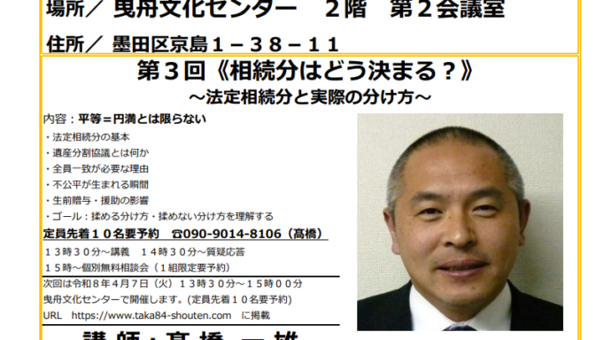 第110回 相続寺子屋東京主催「寺子屋区民講座」のお知らせ